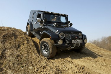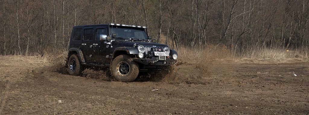 В общем, и здесь найти предел возможностей не удалось. Машина с легкостью преодолевала все предложенные ей препятствия, лишь изредка требуя корректировки траектории, дабы не лечь на грунт «брюхом» — это единственный существенный недостаток длиннобазного Jeep Wrangler. Надо ли говорить, что лебедка не понадобилась ни разу, в какие бы условия мы не помещали этот внедорожник. И глубокие лужи с «бездонным» глиняным основанием и всевозможные участки с неравномерным покрытием. Даже испытание, которое я назвал «верх внедорожной наглости» — въезд на испещренный ямами и канавами песчаный подъем на заднем приводе без включения блокировок — дался Jeep довольно обыденно. То, что вы видите на фото (отчаянно буксующий задними колесами автомобиль, разбрасывающий вокруг себя тонны песка) — просьба фотографа, уставшего от кадров в стиле «машина едет и ничего не происходит».