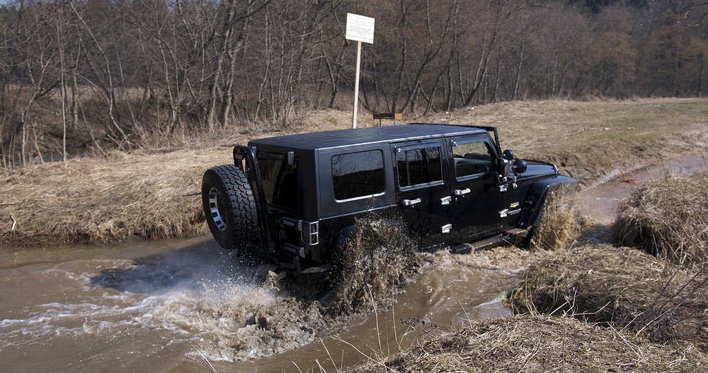 Следующий тест — брод. Надо сказать, что узкая речка, которую я неоднократно с легкостью переезжал на всяческих кроссоверах, на этот раз оказалась широким и глубоким потоком. Весна, знаете ли. В общем, полноценного пересечения реки «вброд» не вышло из-за того, что брод перестал быть бродом (уж простите за тавтологию). Мы ограничились погружением на глубину, ограниченную желанием не залить салон (для верности я проделал это несколько раз). Хоть дверные уплотнители у JK и хороши, но проверять такие вещи на чужой машине мне совершенно не хотелось.