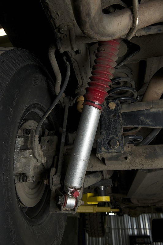 Следующее испытание — тест на артикуляцию подвески. Заключается он в диагональном пересечении острого и высокого земляного гребня. Нет, чудес не случилось, вывешивания мы все-таки добились. Но произошло это отнюдь не по вине великолепной подвески — ее ход не был исчерпан. Все оказалось банальнее. Стандартные расширители колесных арок при такой артикуляции просто не смогли «принять в себя» сильно подросшие колеса. Кстати, на момент написания статьи новые увеличенные расширители фирмы Bushwacker уже ехали в Россию — хозяин автомобиля сделал из нашего теста массу важных выводов и тут же полез в заветный каталог.