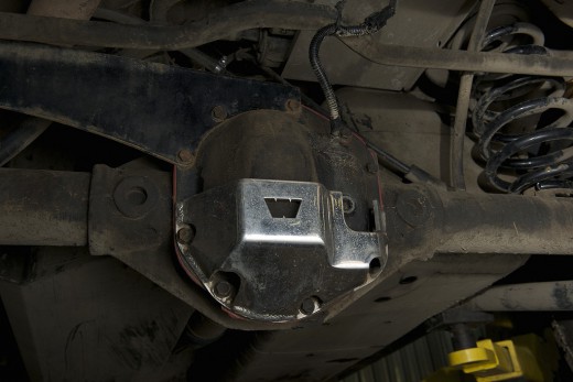 Слева — тот самый знаменитый размыкатель переднего стабилизатора от Wrangler Rubicon, позволяющий подвеске свободно артикулировать на бездорожье и «зажиматься» на асфальте. Справа — управляющий провод межколесной блокировки Eaton, а так же кронштейн усиления крепления тяги Панара (уходит влево). Позаботился хозяин и о защите дифференциала (крышки Warn из 5мм стали).