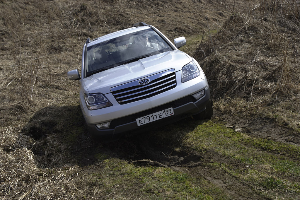 Дорожная резина явно не способствовала хорошему сцеплению с грунтом, поэтому автомобиль все равно приходилось постоянно «ловить» на скользком спуске. Вопрос стоял только один: «как возвращаться?» Но это меня волновало мало. Больше всего беспокоил последний рубеж в виде диагонального холмика, по которому проходила дорожка. На «Жигулях» я бы не раздумывал — там бампера железные, а здесь пришлось снова включать мозг. В итоге машина таки вывесилась, беспомощно вращая колесом. Электроника пыталась что-то сделать, но безуспешно. Перераспределение крутящего момента (так называемые «электронные имитации межколесных блокировок») работало рывками, лишь усугубляя ситуацию. Пришлось вызывать «рояль в кустах» в виде лифтованного Nissan Patrol, на котором со мной приехал фотограф (он же и вытащил обратно на тросе). В общем, «внедорожник» KIA внедорожных способностей не проявил.
